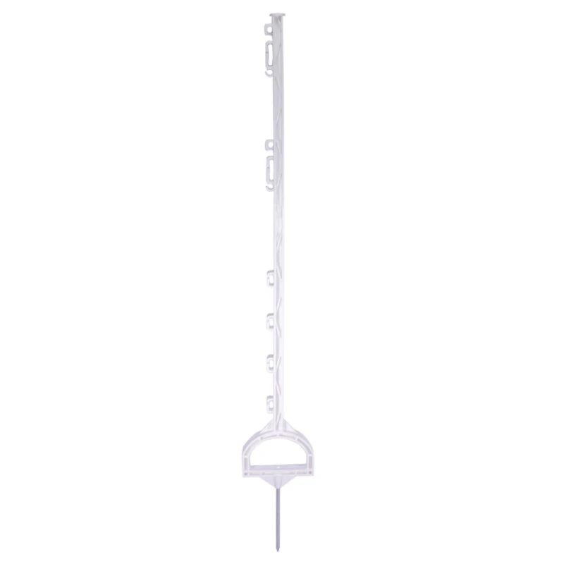Die 20 Weidezaunpfähle »Steigbügel« sind 115cm lange weiße Pfähle aus Kunststoff (6 Band-, 4 Seil-Ösen). Durch Ihrer Länge von 1,15m eignen sich die Kunststoffpfähle für Portionsweiden und andere Weidezäune mit: Kleinpferden, Ponys, Rinder, Bullen, Schafe, aber auch zur Wildabwehr gegen Rehe und Hirsche. Die Steigbügelpfähle sind aus glasfaserverstärktem PP (Polypropylene) und dadurch sehr belastbar und bruchsicher. UV-Stabilisierende Additive im Kunstsstoff der Pfähle schützen die Weidezaunpfähle davor durch Lichteinwirkung brüchig oder spröde zu werden.