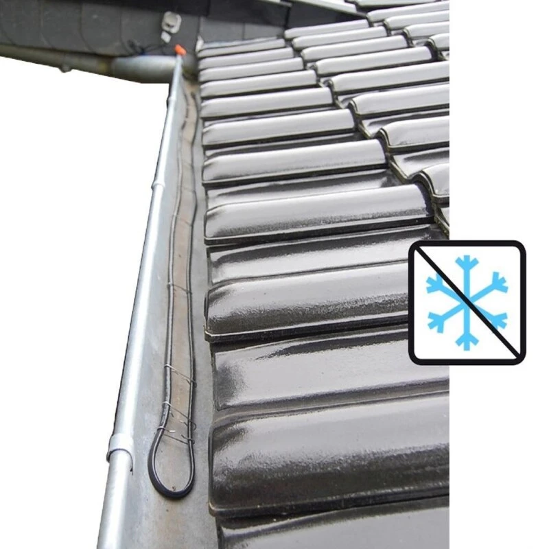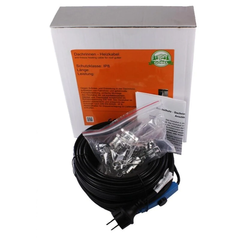Die Dachrinnenheizung »IP 8« ist wasserdicht und für Rohr und Rinne geeignet, 10m – 50m. Gegen Schnee- und Eisbildung in der Dachrinne, aufplatzen von Fallrohren und gefahrvolle Eiszapfenbildung, einfache Montage des Heizkabels das mit konfektioniertem Stecker und Thermostat ausgerüstet ist, Betriebsspannung 230 Volt, der Heizkabel ist absolut wasserdicht und entspricht der Schutzart nach DIN EN 60529 – IP 8, Abstandhalter aus Edelstahl für Doppelverlegung im Lieferumfang enthalten.