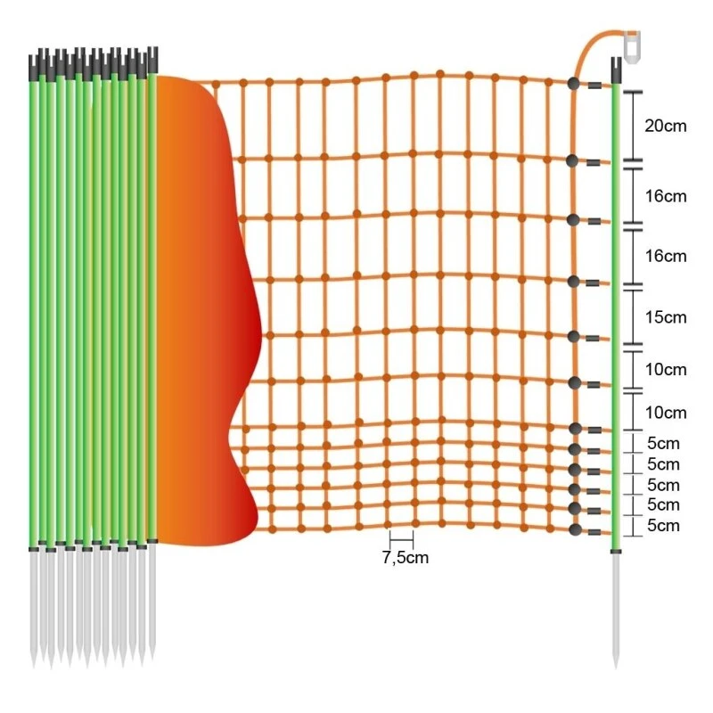 112cm hoch, 25m langer Geflügelzaun von Euronetz. 12 horizontale Kunststofflitzen davon 11 mit eingearbeitetem Chromnickeldraht machen den Geflügelzaun zum Elektrozaun. 9 Pfähle mit Einzelspitze sorgen beim Elektronetz für einfaches Aufstellen. Euro-Netze sind flexibel, da Unebenheiten mit extra Pfählen und Heringen ausgeglichenwerden können. Bodenlitze sind bei diesem Geflügelzaun verstärkt, 32 Kunststoffmonofile Ø 0,40 mm, nicht stromführend- Restliche Litzen je 15 KunststoffmonofileØ 0,40mm, 3 Edelstahldrähte Ø 0,20mm- Die Senkrechten je 15 KunststoffmonofileØ 0,40 mm- UV-stabilisiert- Jeder Maschenkreuzungspunkt mit Kunststoffplombeunlösbar verschweißt.