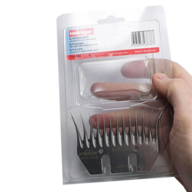 Heiniger XLR-8 714-106 Schermesser. Für die professionelle Schur mit offener Wolle hergestellte Heiniger Schermesser. Maximale Breite. Universalkamm für Mischwolle bis zu feiner Wolle. Gefertigte Schermesser aus Spezialstahl für lange Haltbarkeit. Nachschleifen ist mit den Schermessern mehrmals möglich.