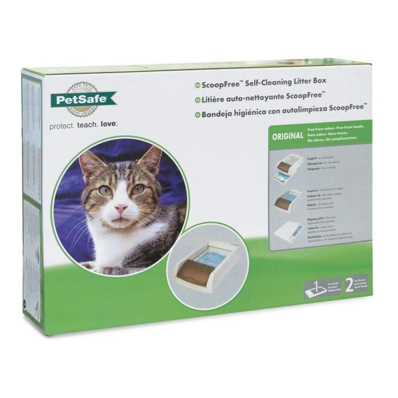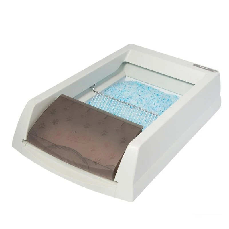Selbstreinigende Katzentoilette „Classic“ mit austauschbaren Ersatzschalen mit Auslaufschutz, die jeweils bis zu 30 Tage halten.