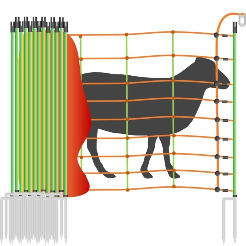 Die Schafzäune »Euronetz« Elektrozaun sind 50m lang, haben 2 Spitzen und sind 90cm hoch. KOMBI: mit den starren Senkrechten, 90 cm hoch – 50 m lang. 9 horizontale Kunststofflitzen, davon 8 mit eingearbeitetem Chromnickeldraht machen das Schutznetz zum Elektrozaun. Abstände der Litzen horizontal 6 x 10 cm, 2 x 15 cm sowie alle 30 cm in den Senkrechten – jeweils 14 Pfähle mit Doppelspitze. EINSATZBEREICH: Schafe, Lämmer, Ziegen. Obere Litze um 80% verstärkt, 24 Kunststoffmonofile Ø 0,40mm, 6 Edelstahldrähte Ø 0,20mm. Bodenlitze verstärkt, nicht stromführend 32 Kunststoffmonofile Ø 0,40mm. Restliche Litzen je 15 Kunststoffmonofile Ø 0,40mm, 3 Edelstahldrähte Ø 0,20mm. UV-stabilisiert. Jeder Maschenkreuzungspunkt mit Kunststoffplombe unlösbar verschweißt. Standfest auch bei hügeligem Gelände oder Bodenunebenheiten. Durch die starren Senkrechten kein durchhängen der Netze