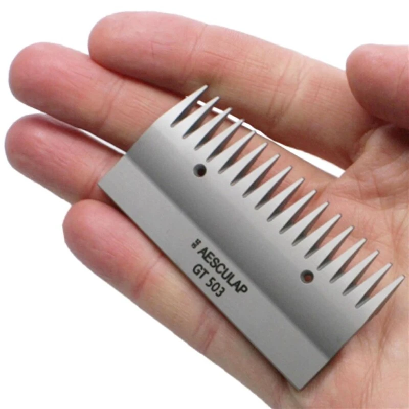 Der Scherkamm »Aesculap GT 503« (obere Schneidplatte 17 Zähne) ist geeignet für Rinder, feinwollige Schafe und Einzelschafe