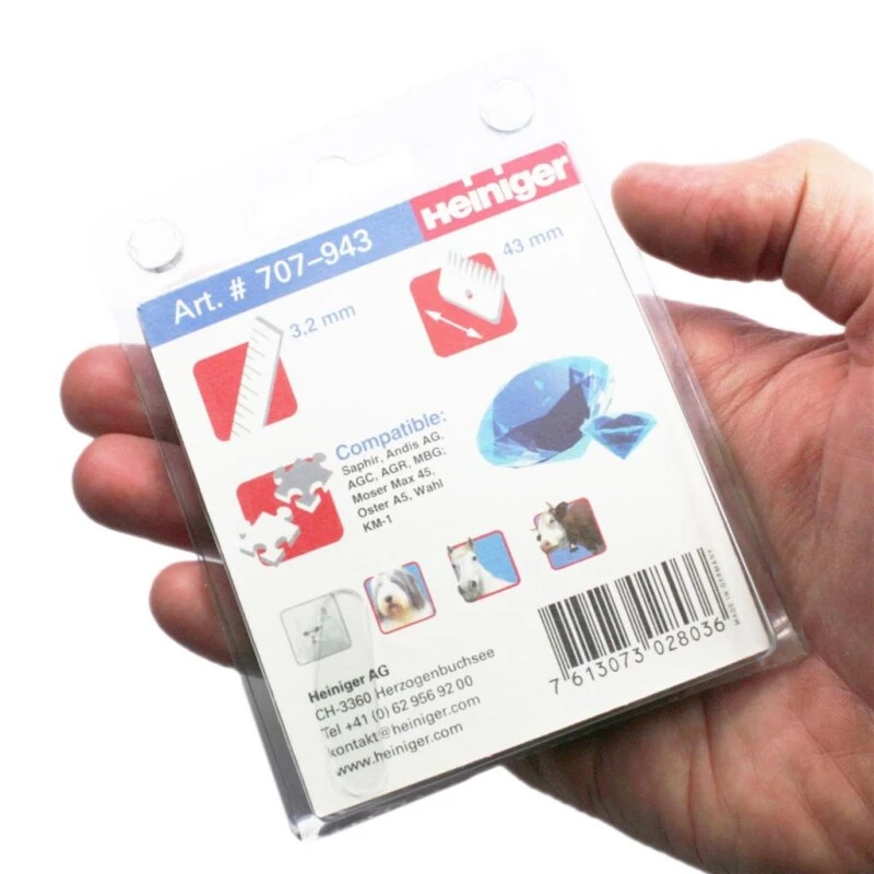 Die Scherköpfe »Heiniger Saphir 7« mit einer Schnitthöhe von 3,2mm sind für Hunde, Pferde und Kühe geeignet