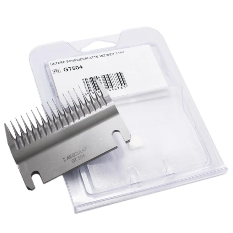 Der Scherkopf »Aesculap GT 504« mit einer Schnitthöhe von 3mm (untere Schneidplatte mit 18 Zähnen) ist geeignet für Rinder, feinwollige Schafe und Einzelschafe
