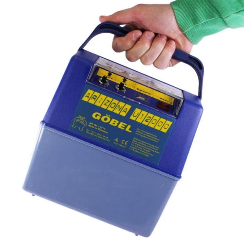Das Weidezaun Kombigerät 9v 12v 230v »Arizona U12000« (9/12/230 Volt, 0,60 Joule) ist für Ihren Weidezaun bis 10km geeignet. Das 3-in-1 Kombi Weidezaungerät Arizona U 12000 bietet Hohe Schlagstärke für jede übliche Stromquelle und damit Flexibilität am Weidezaun. Das Weidegerät ist dazu servicefreundlich und mit geprüftem CE-Zeichen. Egal ob für Ihre Belange gerade eine 9v Weidezaunbatterie ausreicht oder es beispielsweise durch besonders eigensinnige Tiere sinnvoll wäre einen 12V Akku oder mit 230v Anschluss die Weide zu betreiben – das Arizona U 12000 Weidezaungerät kann es leisten. Das Arizona U 12000 nimmt also alles: 9 Volt Trockenbatterie, 12 Volt Nassbatterie, oder 230 Volt Stromanschluss und bietet damit Bewuchsunempfindlichkeit und die Zuverlässigkeit vom Profi am Elektrozaun. Das Weidezaungerät wird mit Erdpfahl auf dem es auch befestigt werden kann geliefert.