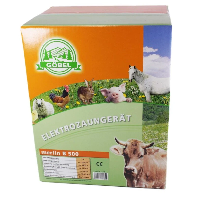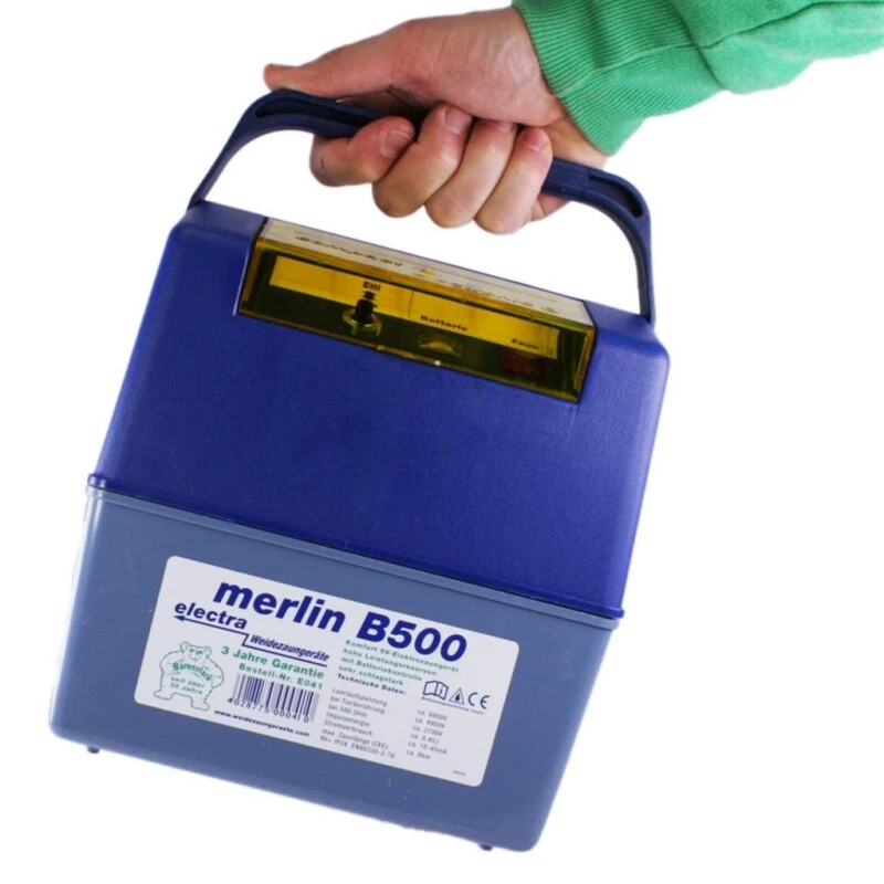 Das 9v Weidezaungerät »Merlin B500« von electra für Weidezäune (9 Volt, 04,45 Joule) ist ein Batteriegerät mit einer empfohlene Zaunlänge von bis zu 8km. Das electra Merlin B 500 ist unser leistungsstärkstes Batteriegerät welches mit 9v als Energiequelle arbeitet. Das Weidezaungerät bietet hohe Leistungsreserven mit Stromsparschaltung und Zaun- und Batteriekontrolle. Das electra Merlin B 500 Weidezaungerät ist bewuchsunempfindlich und für kürzere Weidezäune, aber auch zur lokalen Wildabwehr geeignet. Ein Erdpfahl mit Gerätehalter für das merlin B 500 Weidegerät ist im Lieferumfang enthalten. Electra optimierte das merlin B 500 Weidezaungerät für alkalische 9v Batterien ab 75 AH. Die Lieferung des Weidezaungeräts erfolgt inklusive Anschlusskabel und Erdpfahl auf dem das Weidegerät befestigt werden kann. Für eine bessere Erdung bei einem Betrieb zur Wildabwehr oder bei Trockenheit empfehlen wir einen zusätzlichen Erdpfahl (50cm) mit zu bestellen und einzuschlagen.