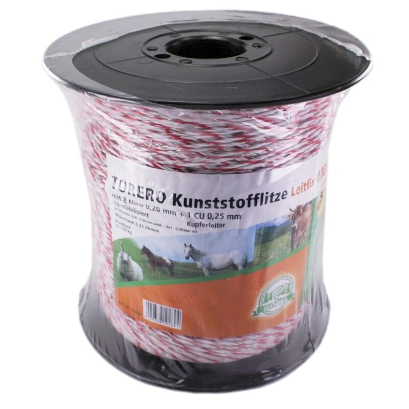 Die Weidezaunlitze »Torero« Kunststofflitze ist 1000m lang (weiß-rot). Die Litzen für den Weidezaun sind aus PE-Monofile 3×6 0,40mm (weiß), 3×1 0,40mm (rot) gefertig. Als Leiter sind in den Weidezaunlitze »Torero« 8 Niro 0,20mm, 1 Cu 0,25mm. Die Weidezaunlitze für Elektrozäune & Weidezäune haben einen elektrischen Widerstand von: 0,23 Ohm/m, Bruchlast: 95kg